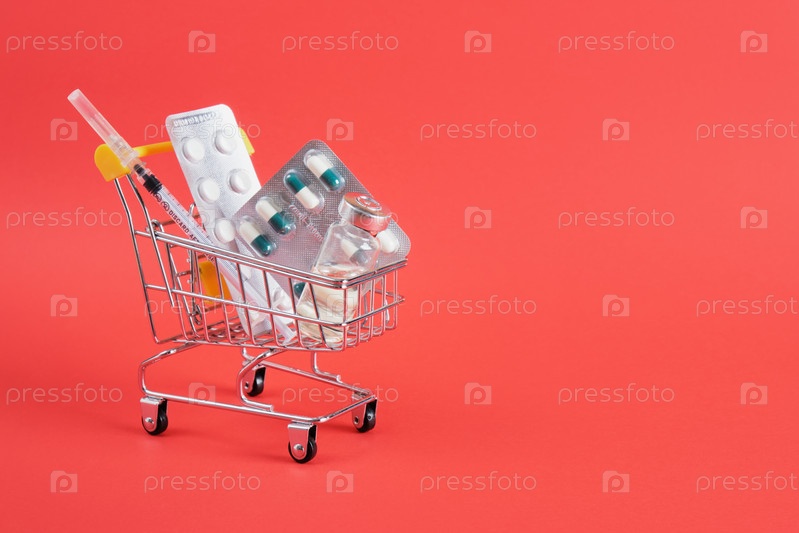 Корзина с лекарством на красном фоне. Концепция медицины и продажа лекарств. Скопируйте пространство