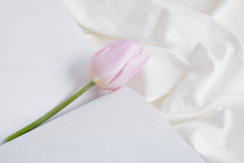 Тюльпан и блокнот на белом постельном белье