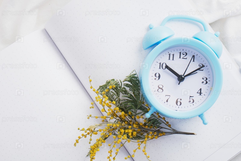 Синий будильник и мимоза на кровати, концепция настроения весеннего утра,