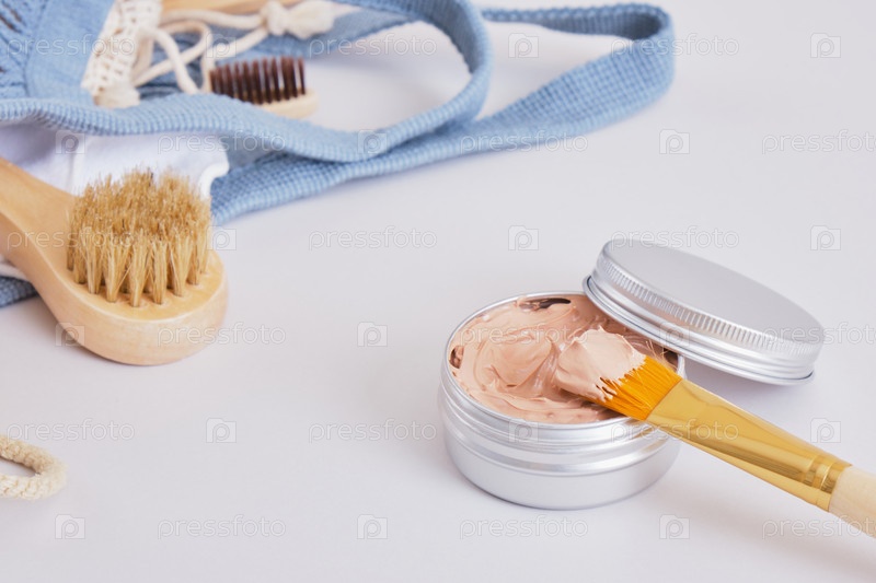 Кисточка для макияжа и косметическая красная глина в алюминиевой банке, набор натуральной косметики и продуктов, безотходный образ жизни, серый фон, пространство для копирования, макет косметики крупным планом