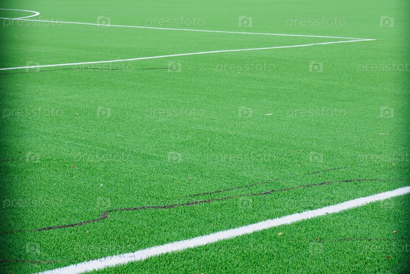 Новое футбольное поле, свежий зеленый газон и белые разделительные линии на футбольном поле, угол и край поля для занятий спортом, разметка поля