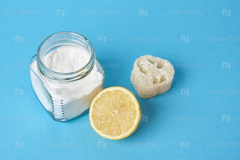 Лимон, мочалка и банка газировки на синем фоне