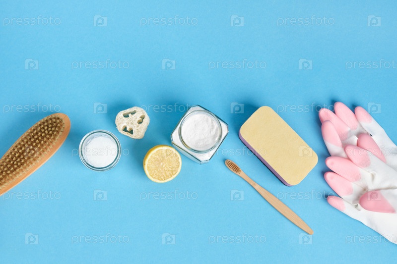 Концепция очистки без отходов, все для нетоксичной очистки, синий фон, концепция образа жизни без пластика