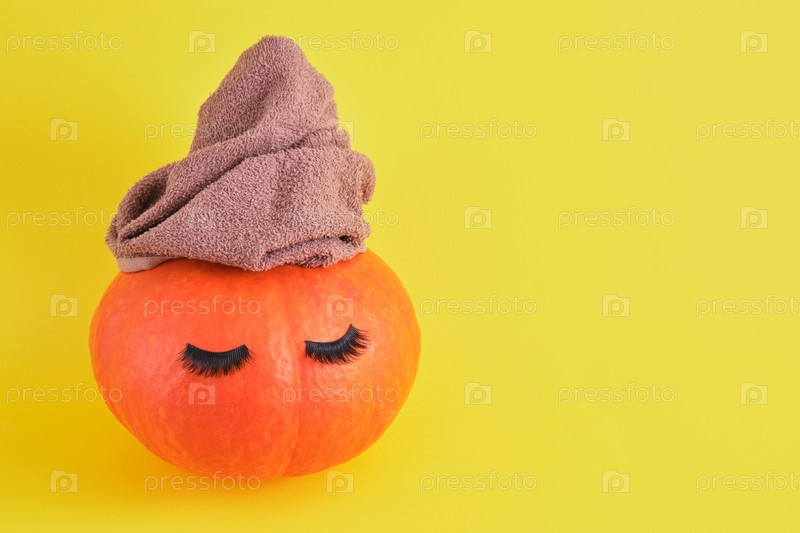 Тыква с полотенцем и накладными ресницами на желтом фоне, уход за кожей и телом в осенней концепции, пространство для копирования спа-салона