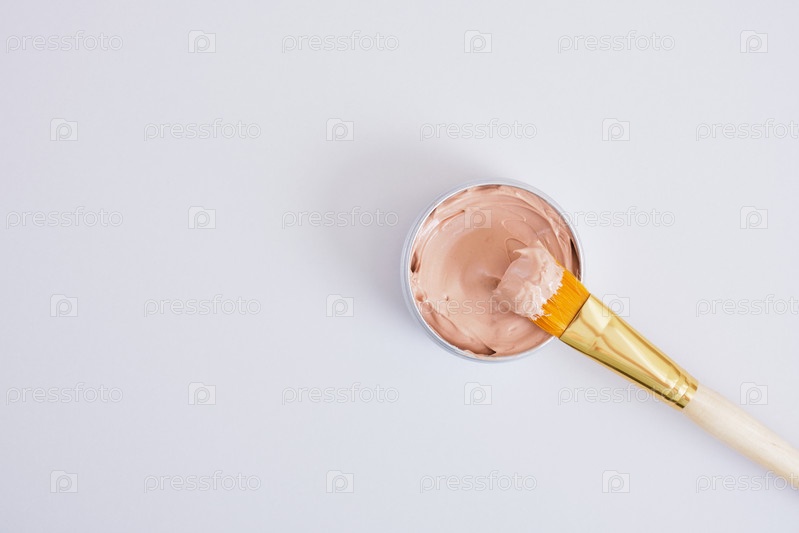 Кисточка для макияжа и косметическая красная глина в алюминиевой банке, натуральная косметика и безотходный образ жизни, серый фон, пространство для копирования