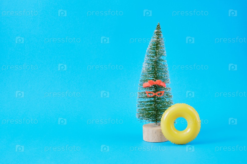 Игрушка декоративная елка и надувной круг на синем фоне. отпуск на пляже для зимних каникул