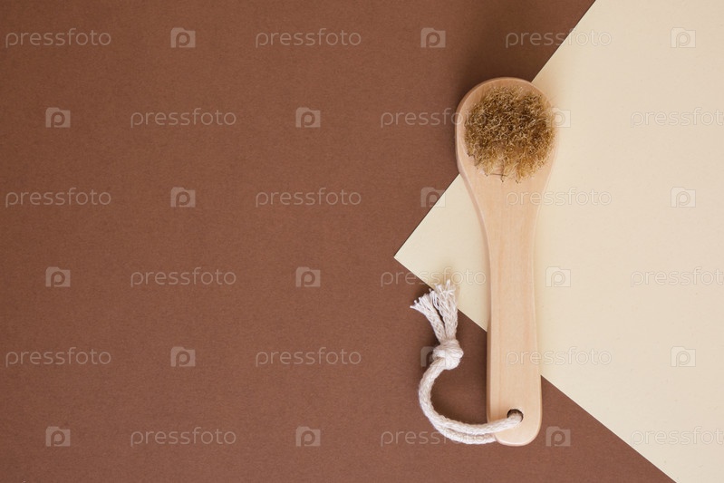 Деревянная щетка с натуральной щетиной для сухого массажа лица на коричневом и бежевом фоне