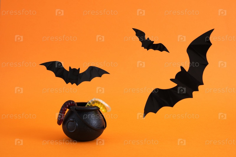 Маленький декоративный ведьмин котел, мармеладные черви, пауки, паутина и летучие мыши на оранжевом фоне, фон хэллоуина