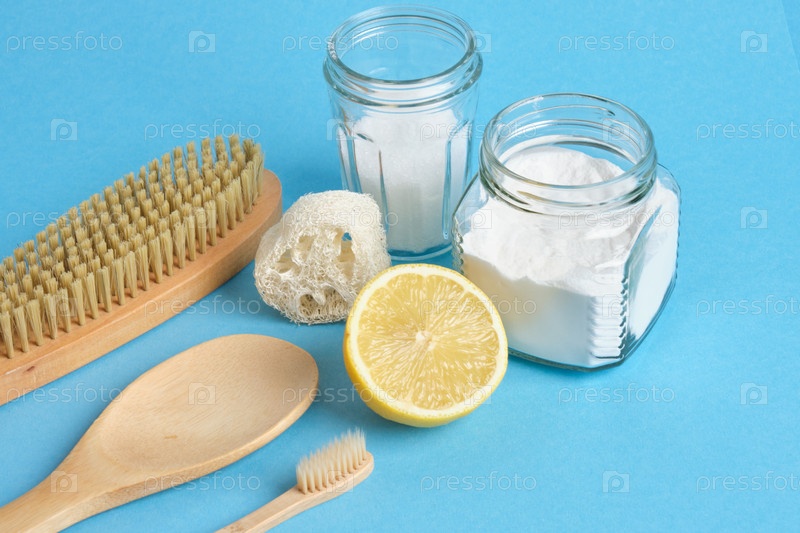 Экологически чистые натуральные чистящие средства и продукты на синем фоне, концепция нулевых отходов. Без пластика