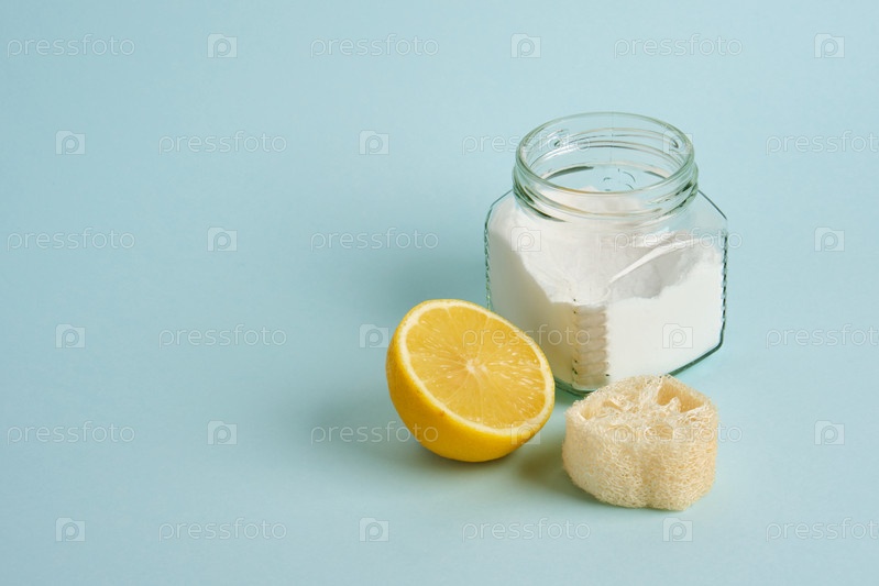 Лимон, мочалка и банка газировки на голубом фоне