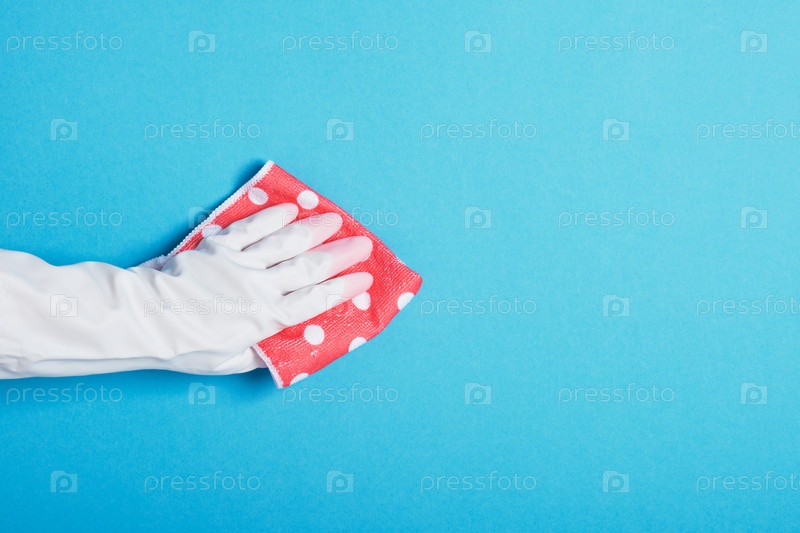Рука в белой резиновой перчатке держит розовую тряпку в горошек, синий фон