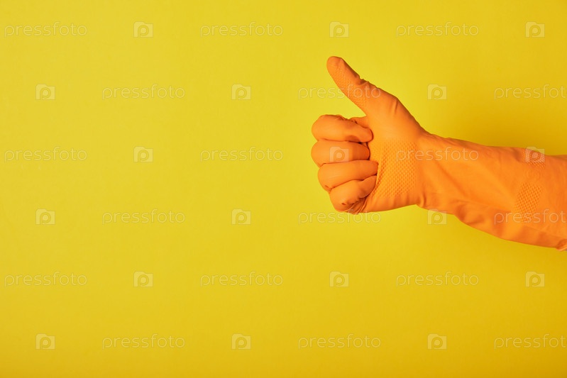 Рука в оранжевой перчатке показывает большой палец вверх на ярко-желтом фоне