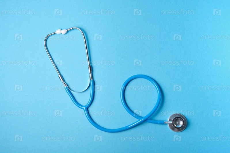 Медицинский стетоскоп на синем фоне, место для копирования, фонендоскоп для диагностики заболеваний