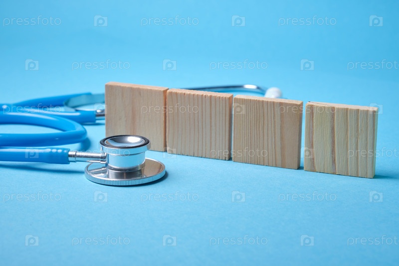 Медицинский стетоскоп и четыре деревянных квадрата на синем фоне, место для копирования, квадраты для написания даты года