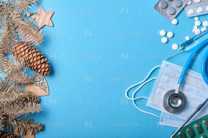 Еловые ветки, сосновые шишки и рождественский декор, стетоскоп, защитная медицинская маска и различные лекарства на синем фоне
