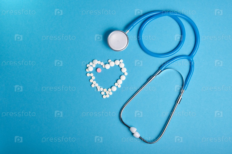 Стетоскоп и сердце от таблеток на синем фоне, концепция кардиологии