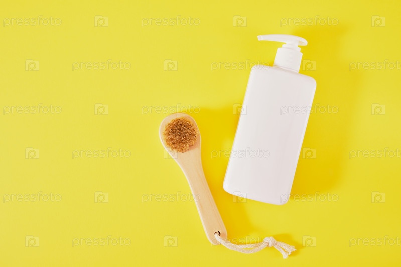 Бутылка крема и массажная щетка на зеленом фоне. массаж лица и концепция ухода за телом