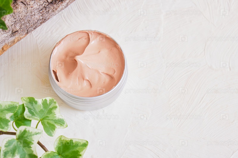 Состав листьев растений, кора дерева, косметическая розовая глина в алюминиевой банке, натуральная косметика и концепция образа жизни без отходов, текстурированный фон, макет пространства для копирования