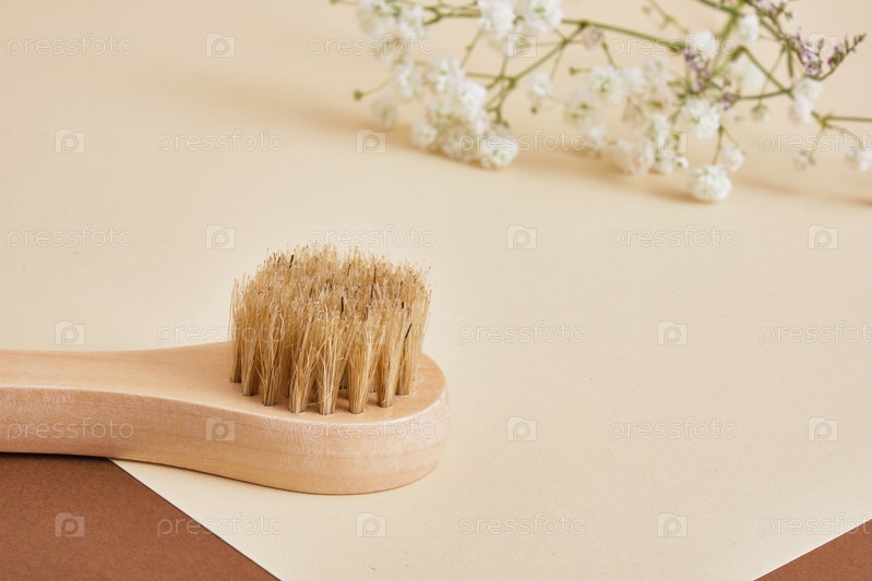 Цветы и деревянная щетка с натуральной щетиной для сухого массажа лица на коричневом и бежевом фоне экологически чистый образ жизни