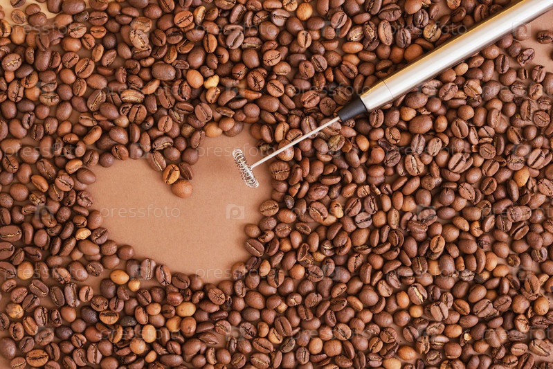 Сердце из кофейных зерен и металлический ручной пароход молока на коричневом фоне. Ручной пенообразователь крупным планом. копировать пространство