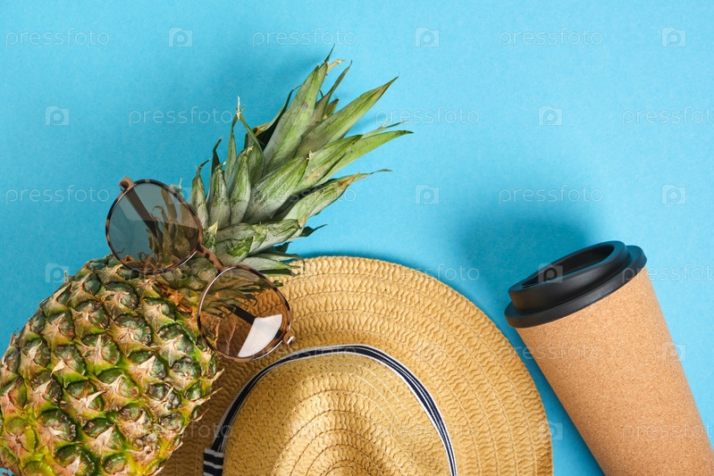 Термочашка, ананас в солнцезащитных очках и соломенной шляпе, на синем фоне концепция отпуска в тропиках копией пространства