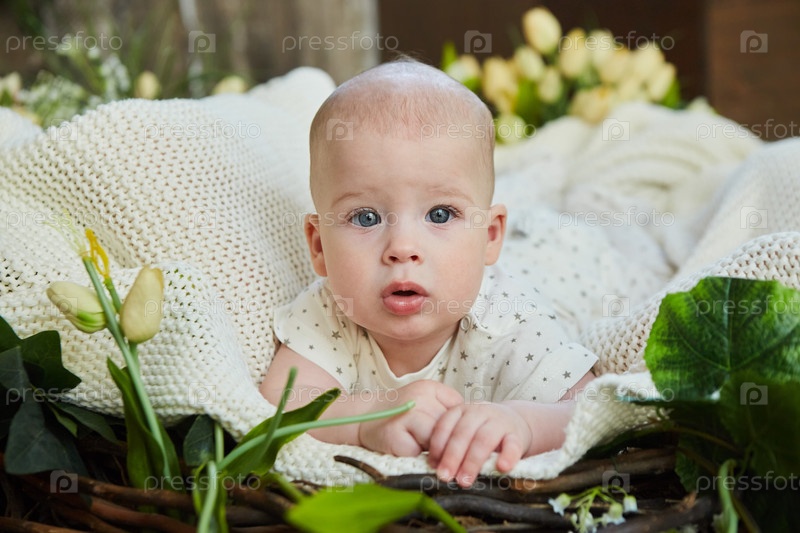 Милый маленький ребенок лежит на мягком одеяле и куче желтых тюльпанов. Концепция весенних праздников и Пасхи
