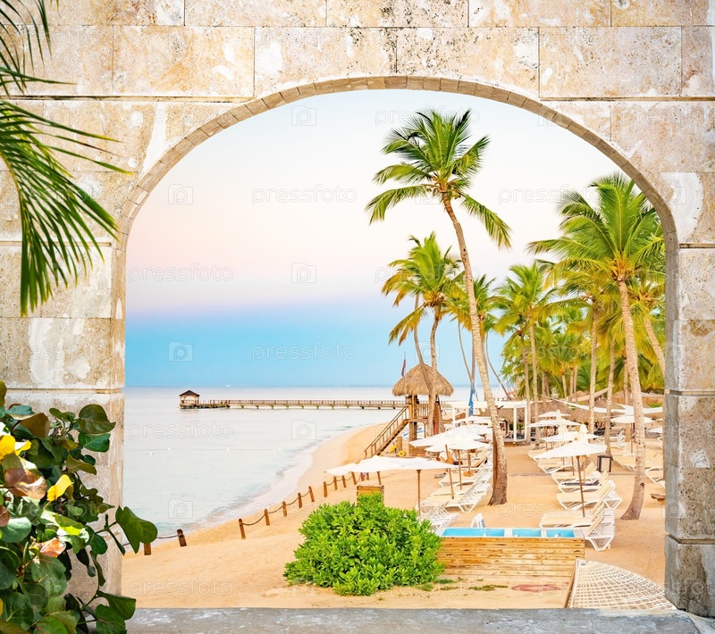 Деревянная арка с открытой дверью выход на пляж карибский доминиканская республика
