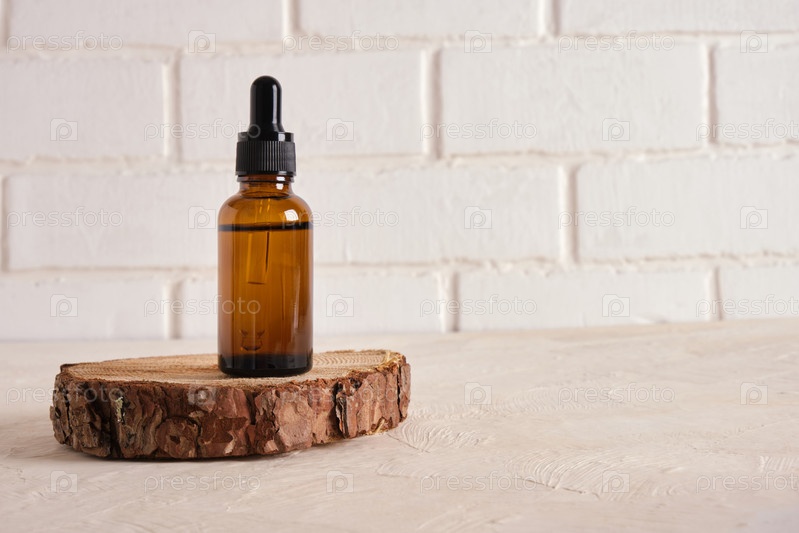 Коричневая стеклянная бутылка с пипеткой на спиле дерева на бежевом текстурированном фоне