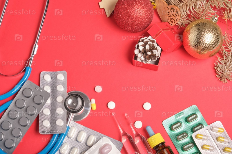 Рождественский декор, стетоскоп и различные лекарства на красном фоне, место для копирования, вид сверху