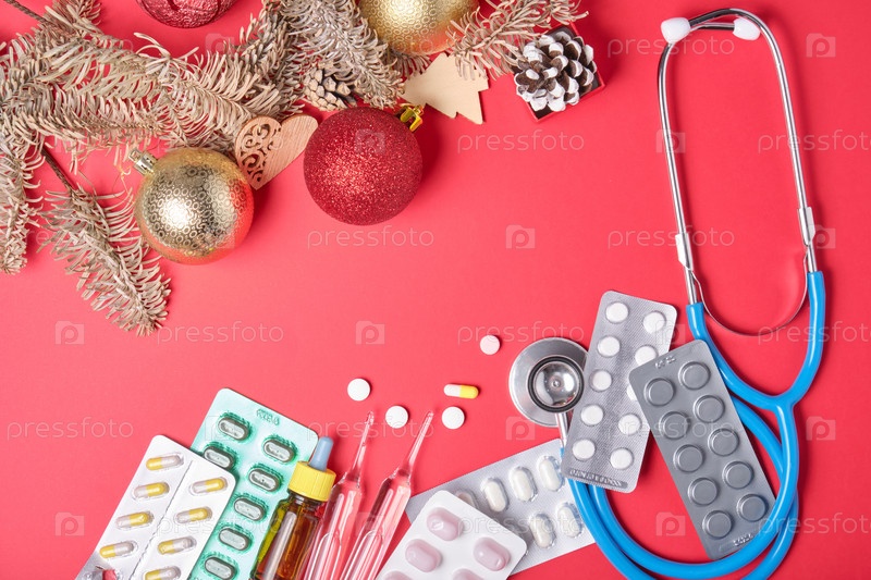 Рождественский декор, стетоскоп и различные лекарства на красном фоне, место для копирования, вид сверху