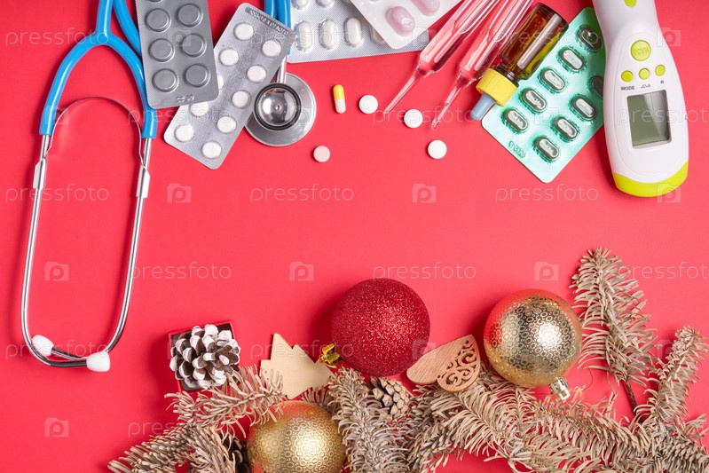 Рождественский декор и медицинские инструменты на красном фоне, место для копирования, вид сверху