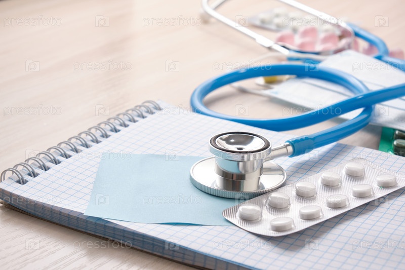 Лекарства, таблетки, медицинский стетоскоп и блокнот для заметок, концепция диагностики заболеваний