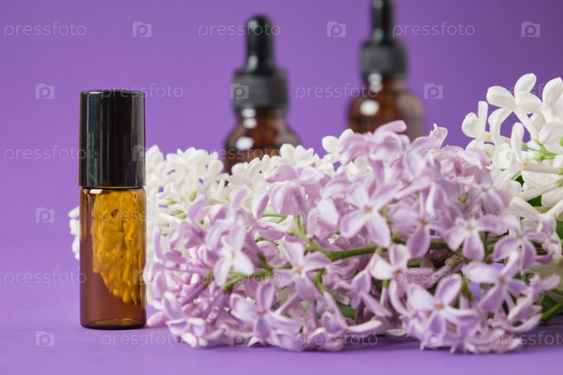 Коричневая бутылка с металлическим аппликатором для духов ручной работы и сиреневый цвет на ярко-фиолетовом фоне