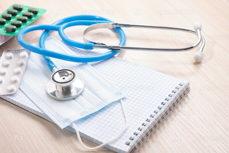 Лекарства, таблетки, медицинский стетоскоп и блокнот для заметок, концепция диагностики заболеваний