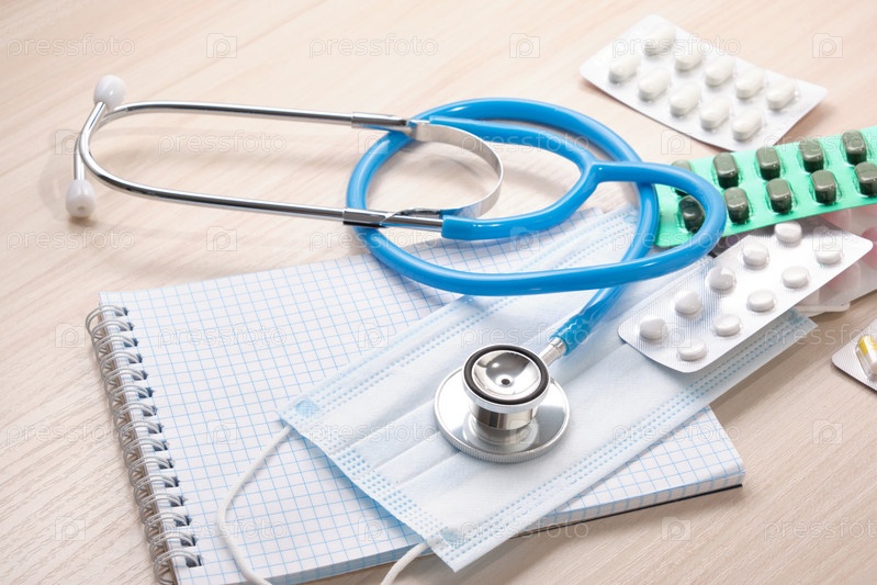 Лекарства, таблетки, медицинский стетоскоп и блокнот для заметок, концепция диагностики заболеваний