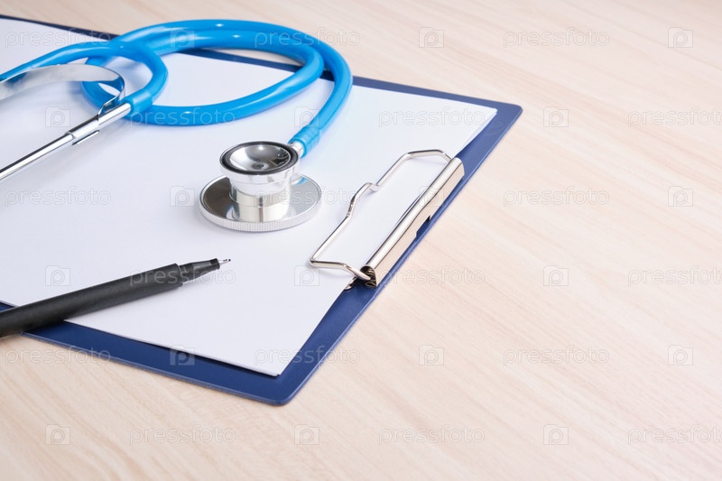 Таблетки, стетоскоп и блокнот на деревянном столе