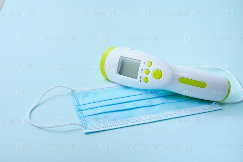 Цифровой медицинский инфракрасный бесконтактный термометр для измерения температуры, маска для лица на синем фоне