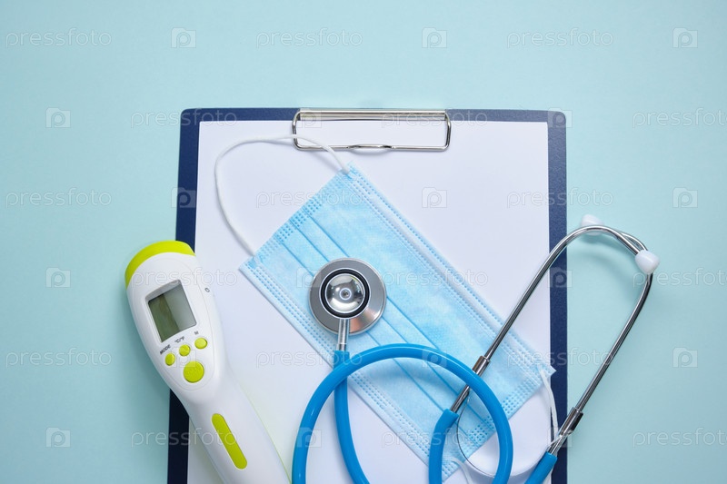Медицинская маска для лица, бесконтактный термометр, держатель для бумаги с пустыми белыми листами, медицинский стетоскоп, таблетки на синем фоне, место для копирования