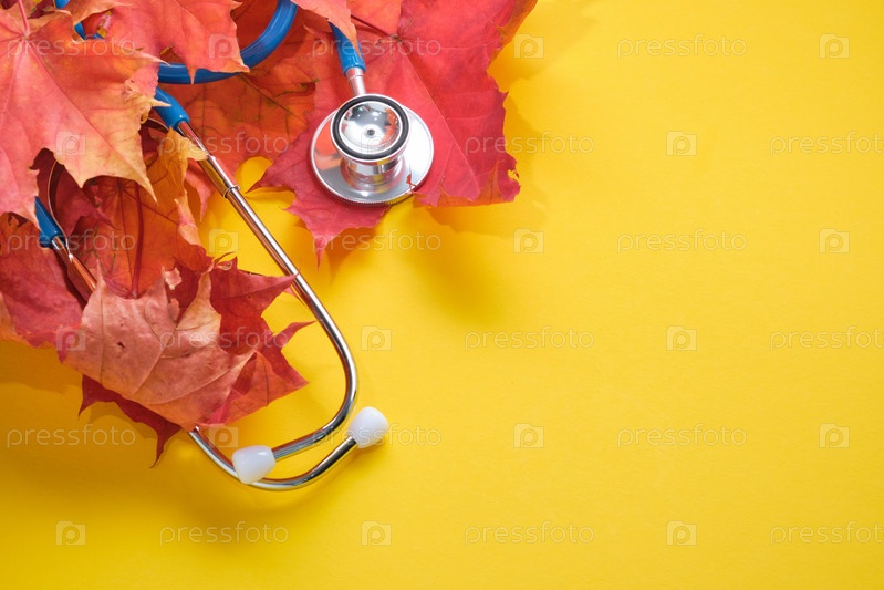 Стетоскоп и осенние кленовые листья на желтом фоне копией пространства