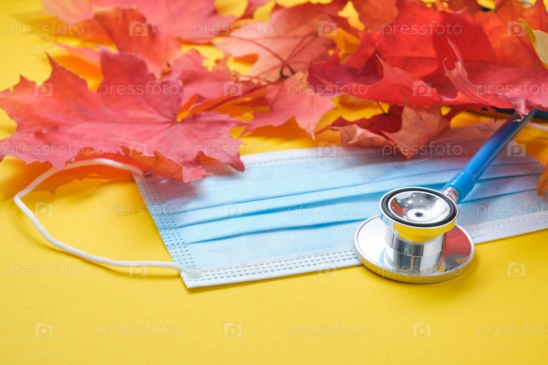 Одноразовая защитная медицинская маска и стетоскоп и осенние кленовые листья на желтом фоне копируют местоположение, концепция сезонных простуд, пандемия коронавируса 2020