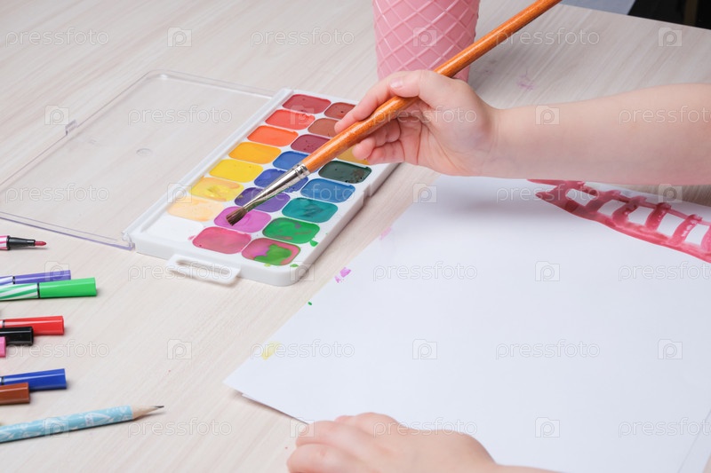 Маленький ребенок рисует акварелью на бумаге за столом