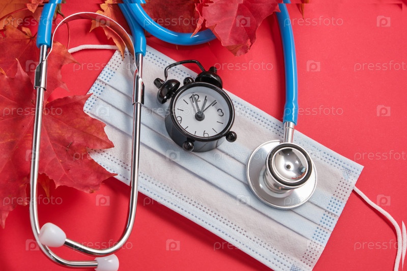 Черный маленький будильник, медицинская защитная одноразовая маска и стетоскоп и осенние кленовые листья на красном фоне