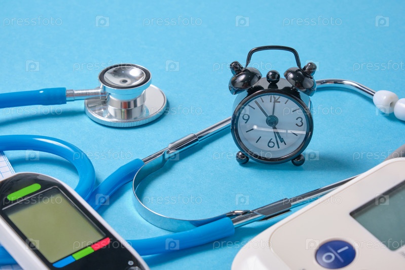 Цифровой тонометр, глюкометр, стетоскоп, блокнот и будильник на синем фоне