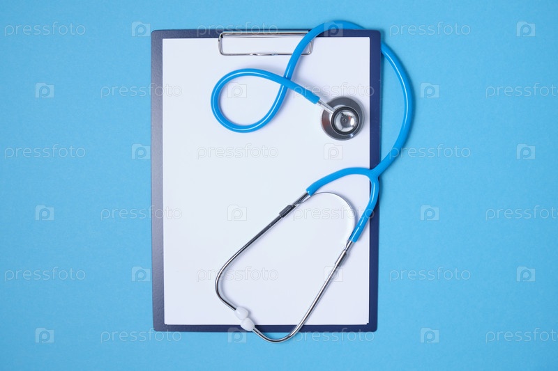 Буфер обмена и стетоскоп на синем фоне копией пространства вид сверху
