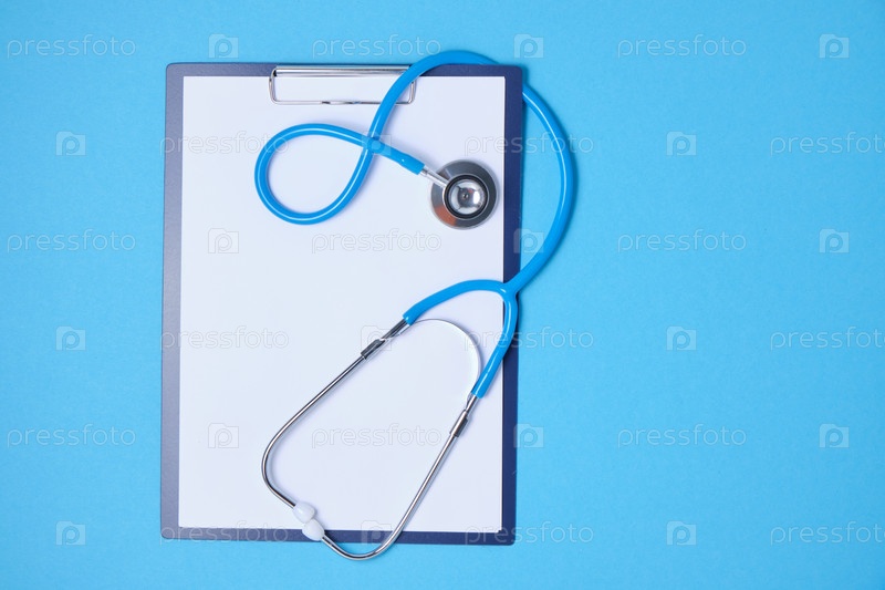 Буфер обмена и стетоскоп на синем фоне копией пространства вид сверху
