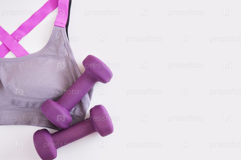 Спортивный бюстгальтер и две гантели на сером фоне копией пространства