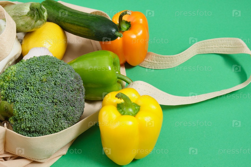 Овощи в тканевой эко сумке на зеленом фоне вид сверху