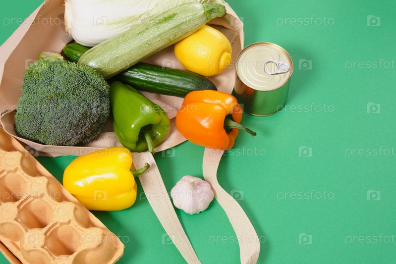 Продуктовая еда в тканевой эко-сумке на зеленом фоне, вид сверху, концепция образа жизни без отходов, многоразовая сумка для покупок