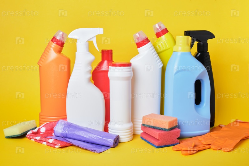 Цветные пластиковые бутылки с моющим средством на желтом фоне