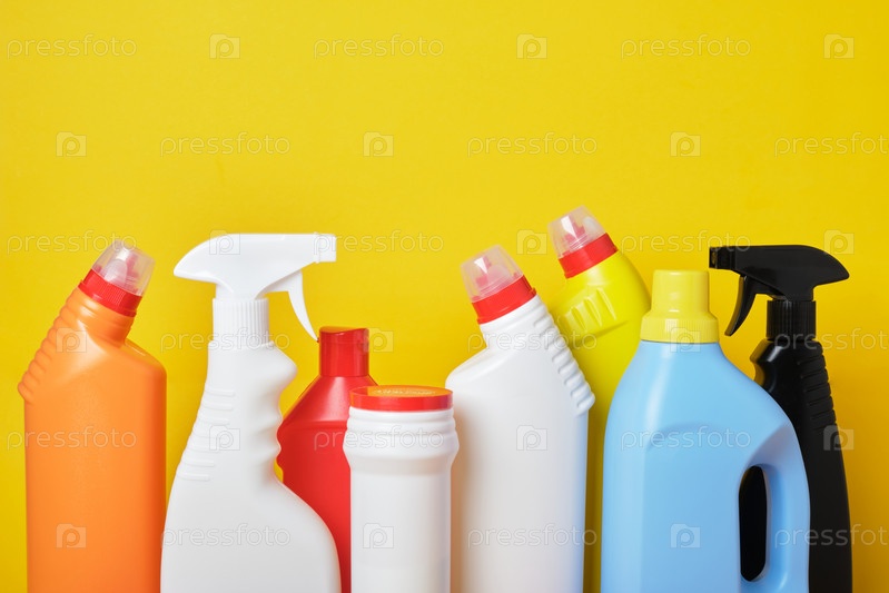 Цветные пластиковые бутылки с моющим средством на желтом фоне